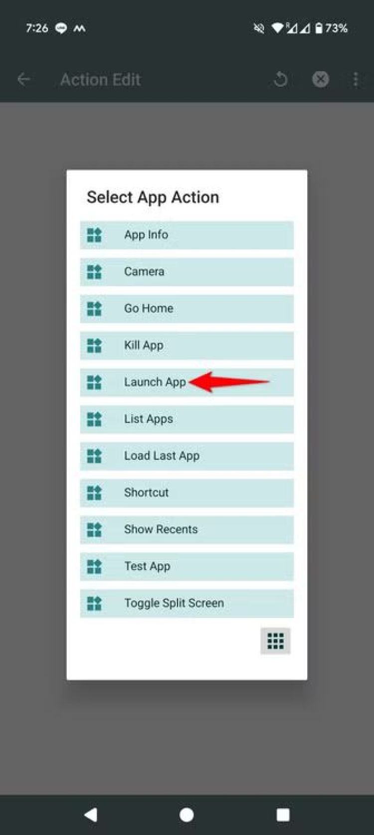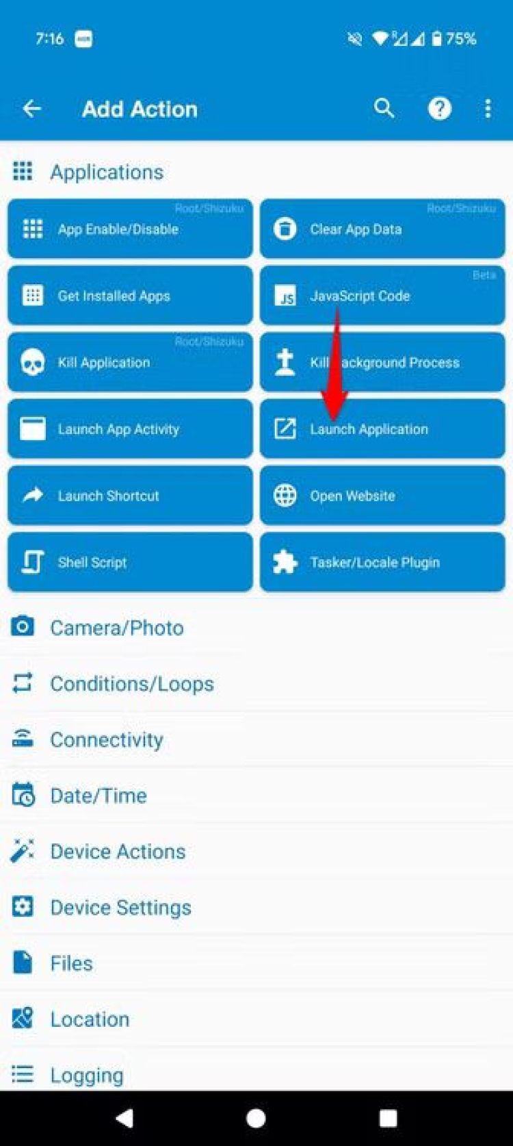 Trong phần Hành động, chạm vào dấu "+" (cộng) để thêm hành động mới. Chọn "Ứng dụng" và chọn "Khởi chạy ứng dụng". Cấp cho ứng dụng quyền cần thiết. Chọn "Khởi chạy ứng dụng" một lần nữa, chạm vào "Chọn ứng dụng" và chọn ứng dụng bạn muốn MacroDroid khởi chạy.
