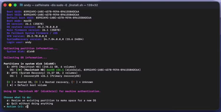 Đầu tiên là phân vùng. Nhập "r" để bắt đầu quá trình. Nhập dung lượng bạn muốn cho phân vùng macOS hiện tại, tính bằng GB hoặc phần trăm, hoặc nhập "min" để giảm dung lượng xuống mức nhỏ nhất có thể. Tôi chọn "min" vì dung lượng hạn chế.