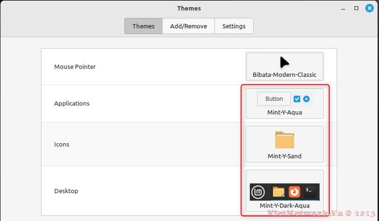 Một lần nữa, giao diện sẽ trông khác nhau tùy thuộc vào bản phân phối và DE chính xác của bạn. Nhưng trong Cinnamon, có ba danh mục bạn có thể thay đổi thành Windows: Ứng dụng, Biểu tượng và Màn hình nền. Nhấp vào nút trong mỗi danh mục để mở các tùy chọn.