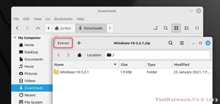 Bạn muốn sử dụng giao diện máy tính để bàn thay vì dòng lệnh? Chỉ cần mở trình duyệt tệp của bạn và tìm tệp ZIP đã tải xuống. Nó nên được đặt tên giống như "Windows-10-3.2.1.zip". Bấm đúp vào nó để mở hộp thoại trích xuất, hộp thoại này sẽ trông khác nhau tùy thuộc vào bản phân phối và DE của bạn. Dù thế nào đi nữa, vẫn phải có nút "Trích xuất" đáng chú ý để bạn nhấp vào. Trong ví dụ của chúng tôi, nó nằm ở góc trên bên trái của hộp thoại.