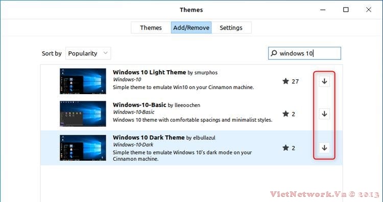 Tất nhiên, giao diện này sẽ khác nhau tùy thuộc vào môi trường máy tính để bàn của bạn, nhưng trên Cinnamon, bạn có thể đi tới Chủ đề > Thêm/Xóa và nhập "windows 10" vào thanh tìm kiếm để tìm chủ đề do cộng đồng tải lên. Nhấp vào nút tải xuống bên cạnh nút bạn muốn.
