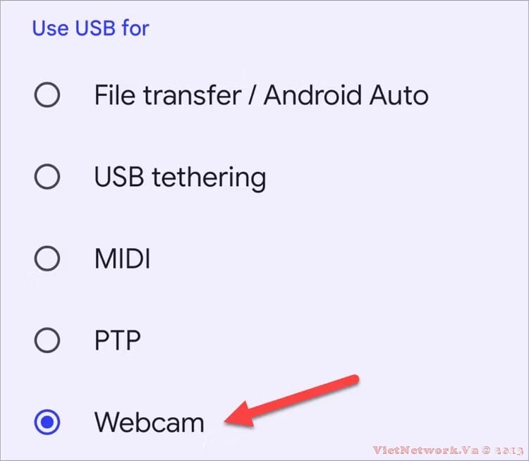 Bây giờ hãy chọn "Webcam" trong phần Sử dụng USB cho".