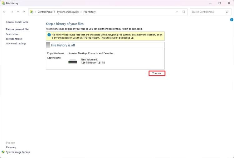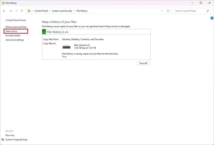 Ngoài ra, Lịch sử tệp yêu cầu một vị trí lưu trữ riêng cho các bản sao lưu của bạn, nghĩa là bạn phải kết nối ổ cứng ngoài có đủ dung lượng lưu trữ với máy tính để thiết lập tính năng này.