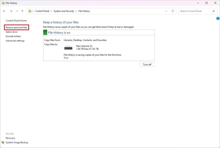 Nhấp vào tùy chọn "Khôi phục tệp cá nhân" ở ngăn bên trái.