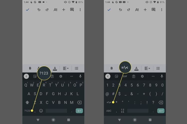 Khi tài liệu của bạn mở ra, hãy đặt con trỏ vào vị trí bạn muốn đặt mũi tên và nhấn phím  ?123  để mở bàn phím số