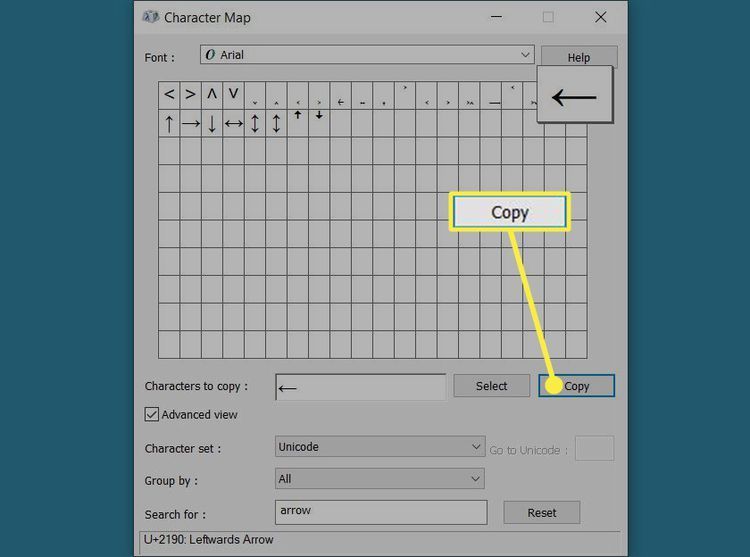 Khi bạn thấy mũi tên bạn muốn sử dụng, hãy chọn mũi tên đó và nhấp vào  Chọn. Thao tác này sẽ di chuyển mũi tên đó đến  hộp Ký tự cần sao chép .