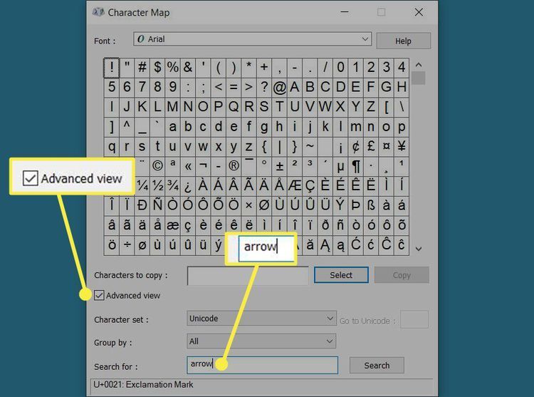 Để đẩy nhanh quá trình, bạn có thể đánh dấu vào ô  Advanced view  ở phía dưới, nhập "mũi tên" vào  ô Search for và nhấp vào  Search.