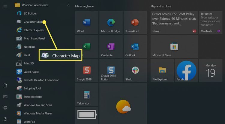 Mở  Bản đồ ký tự  bằng cách sử dụng  Start  >  Windows Accessories,  hộp Tìm kiếm  hoặc bằng  Cortana.
