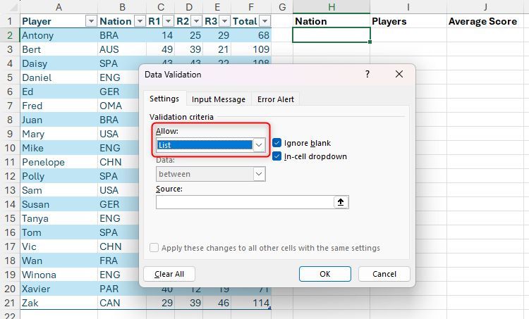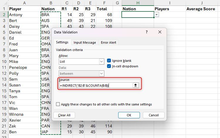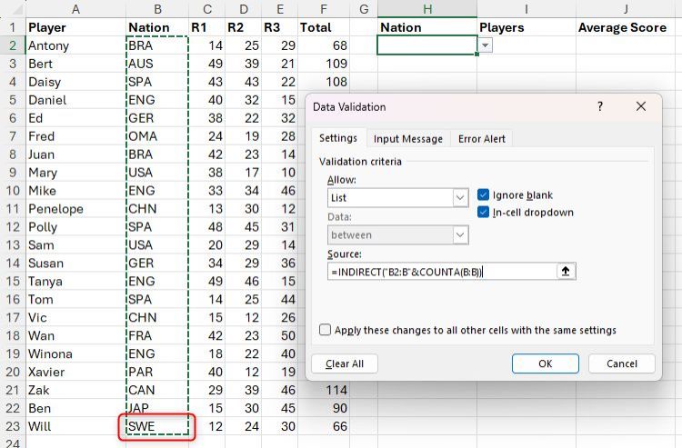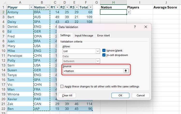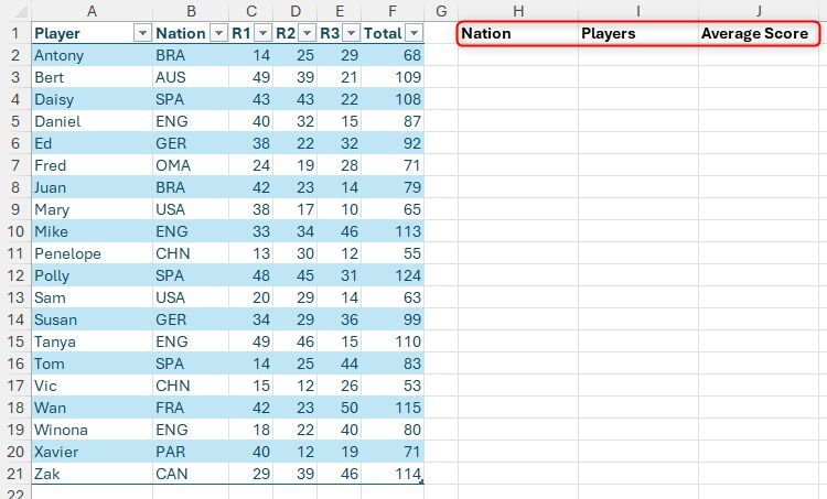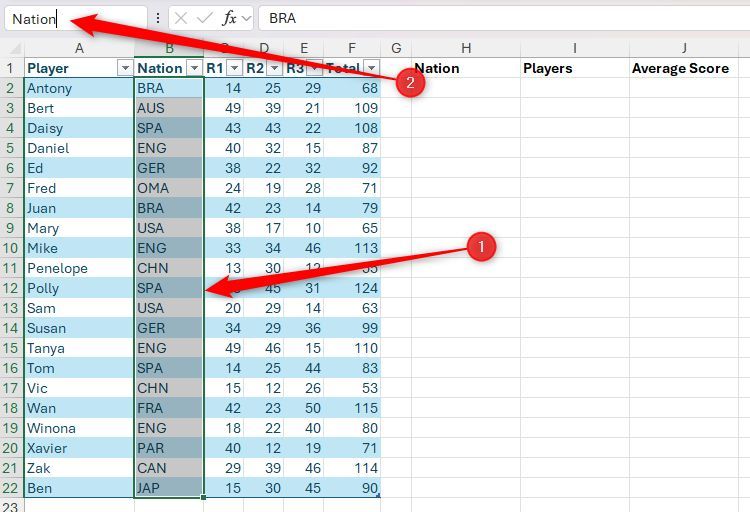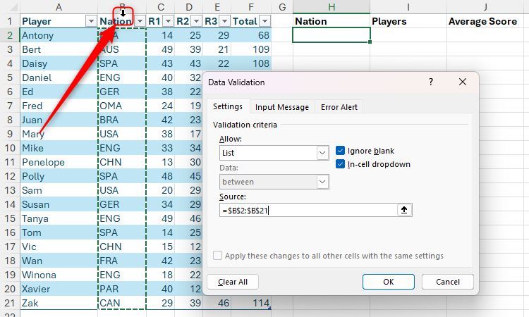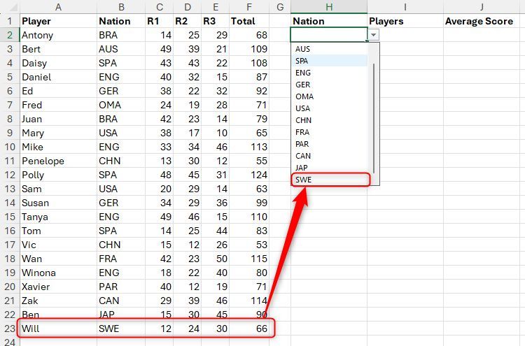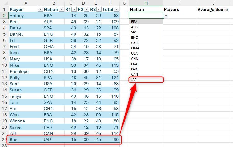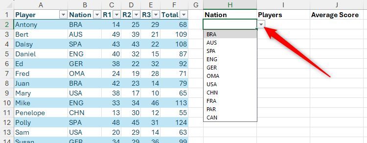 Hãy tưởng tượng bạn có bảng Excel được định dạng này có tên là "Điểm" chứa tên người chơi, quốc gia và điểm số, và bạn cần trích xuất một số dữ liệu tóm tắt. Cụ thể, trong ô H2, bạn muốn tạo danh sách thả xuống của tất cả các quốc gia được liệt kê trong cột B và trong các ô I2 và J2, hiển thị tên người chơi và điểm trung bình tương ứng theo quốc gia đã chọn.