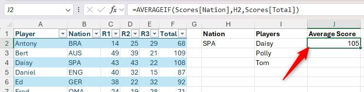 =AVERAGEIF(Scores[Nation],H2,Scores[Total])