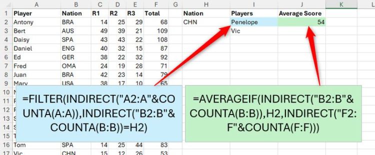 Cuối cùng, sử dụng hàm AVERAGEIF trong ô J2 để hiển thị điểm trung bình của người chơi từ quốc gia này: