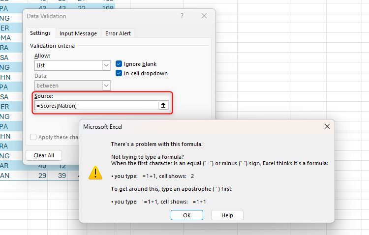 vào trường Nguồn, chính xác như khi bạn tham chiếu cột đó trong công thức, trong đó "Điểm" biểu thị tên bảng và "Quốc gia" biểu thị tiêu đề cột. Tuy nhiên, thật không may, điều này trả về thông báo lỗi vì công cụ xác thực dữ liệu chỉ nhận dạng các tham chiếu ô, công thức và phạm vi được đặt tên là nguồn dữ liệu, không phải tiêu đề cột bảng.