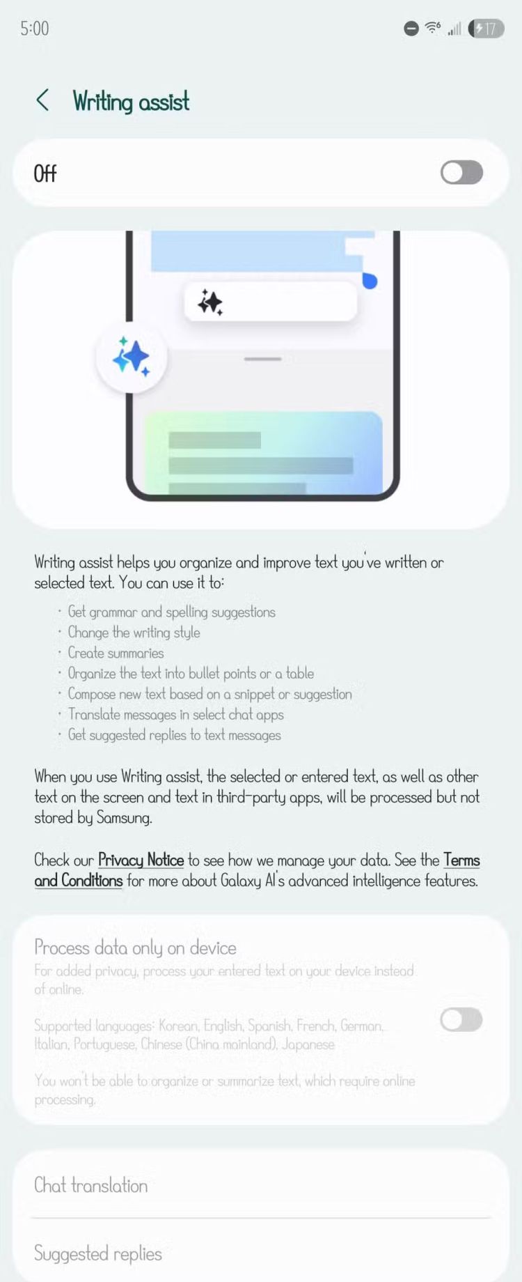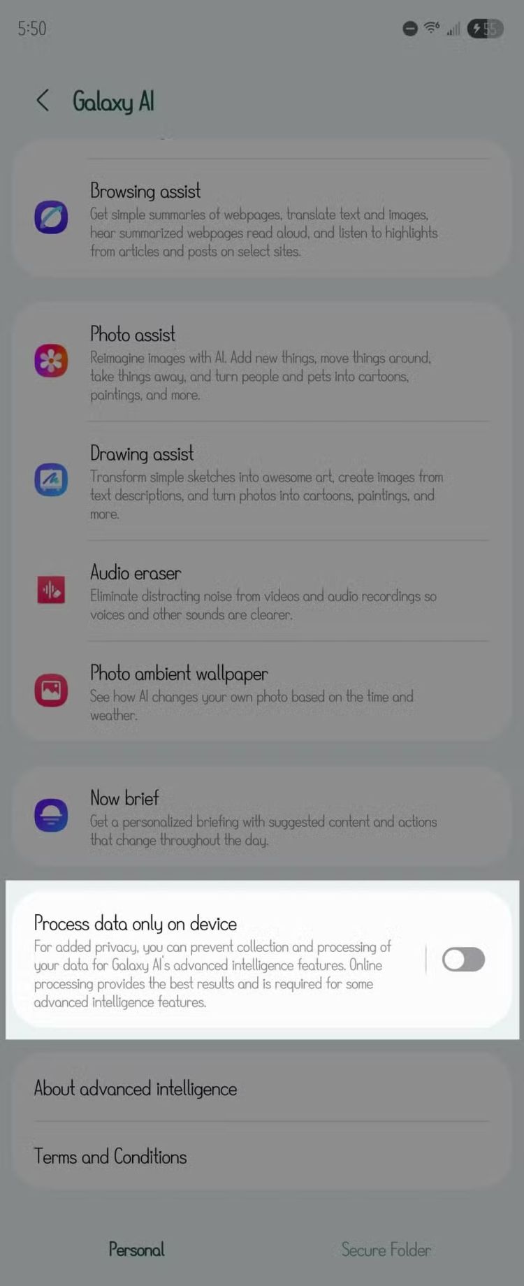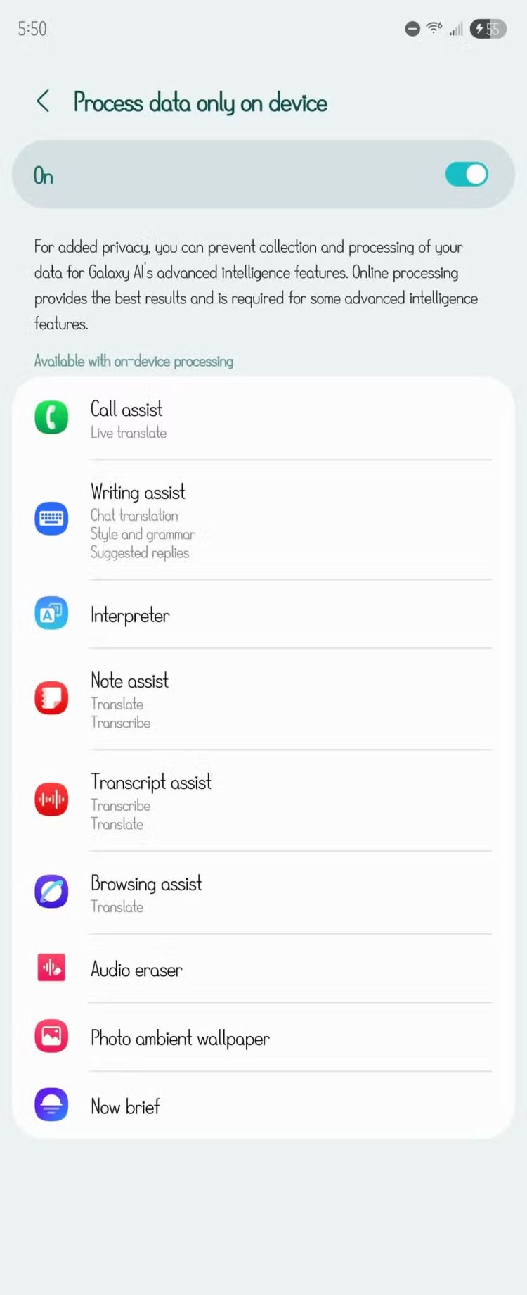 Đây là một điểm nữa mà Samsung đã làm rất tốt trong việc giúp bạn phân biệt những gì được thực hiện trên đám mây và những gì được thực hiện trực tiếp trên điện thoại. Bạn thậm chí có thể duy trì các tính năng AI trên thiết bị trong khi tắt tất cả các chức năng AI dựa trên đám mây. Để thực hiện việc này, hãy quay lại Cài đặt > Galaxy AI và cuộn xuống. Bạn sẽ thấy một cài đặt có nhãn "chỉ xử lý dữ liệu trên thiết bị". Như mô tả, tính năng này nhằm mục đích ngăn chặn việc thu thập và xử lý dữ liệu để sử dụng các tính năng AI.
