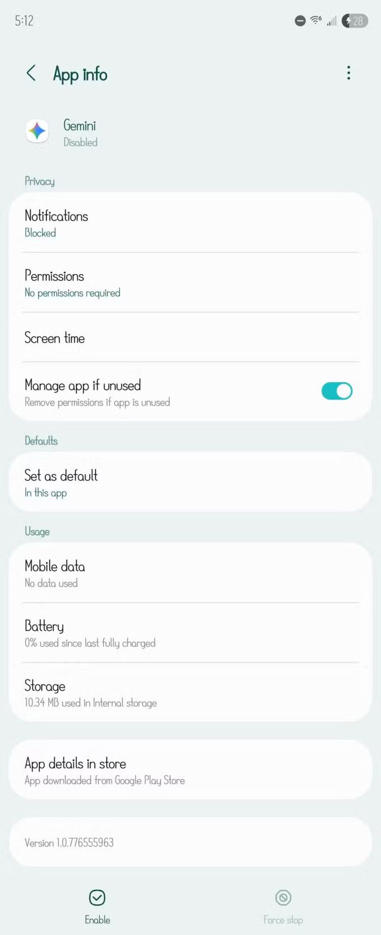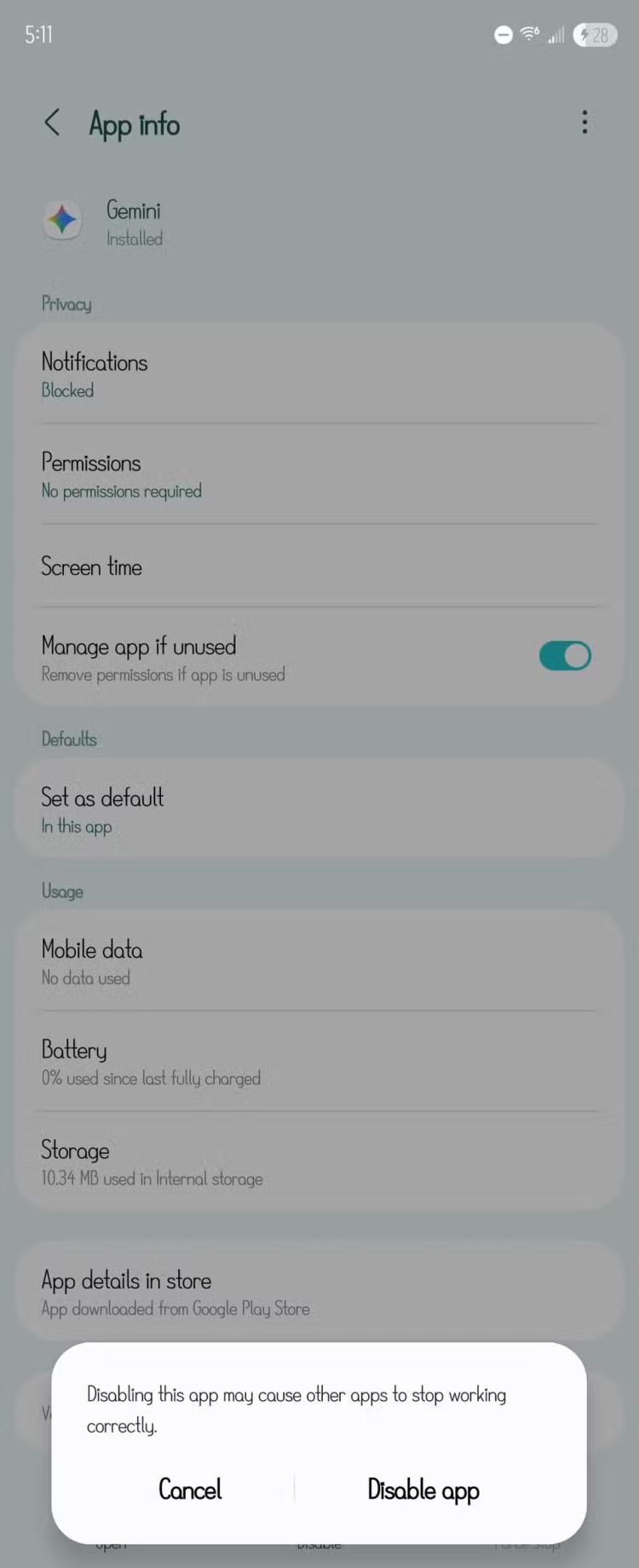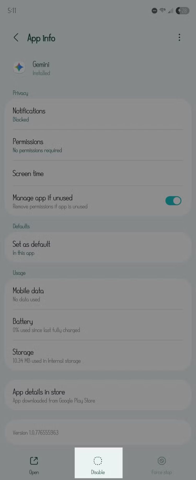 May mắn thay, Gemini được tích hợp trong một ứng dụng duy nhất, và bạn có thể tắt toàn bộ trải nghiệm này chỉ trong một ứng dụng. Nếu bạn không muốn nói chuyện với Gemini, bạn có thể tắt tính năng này bằng cách vào Cài đặt > Ứng dụng và tìm kiếm Gemini. Bạn không thể gỡ cài đặt ứng dụng, nhưng có thể tắt nó để ngăn phần mềm chạy ngầm.
