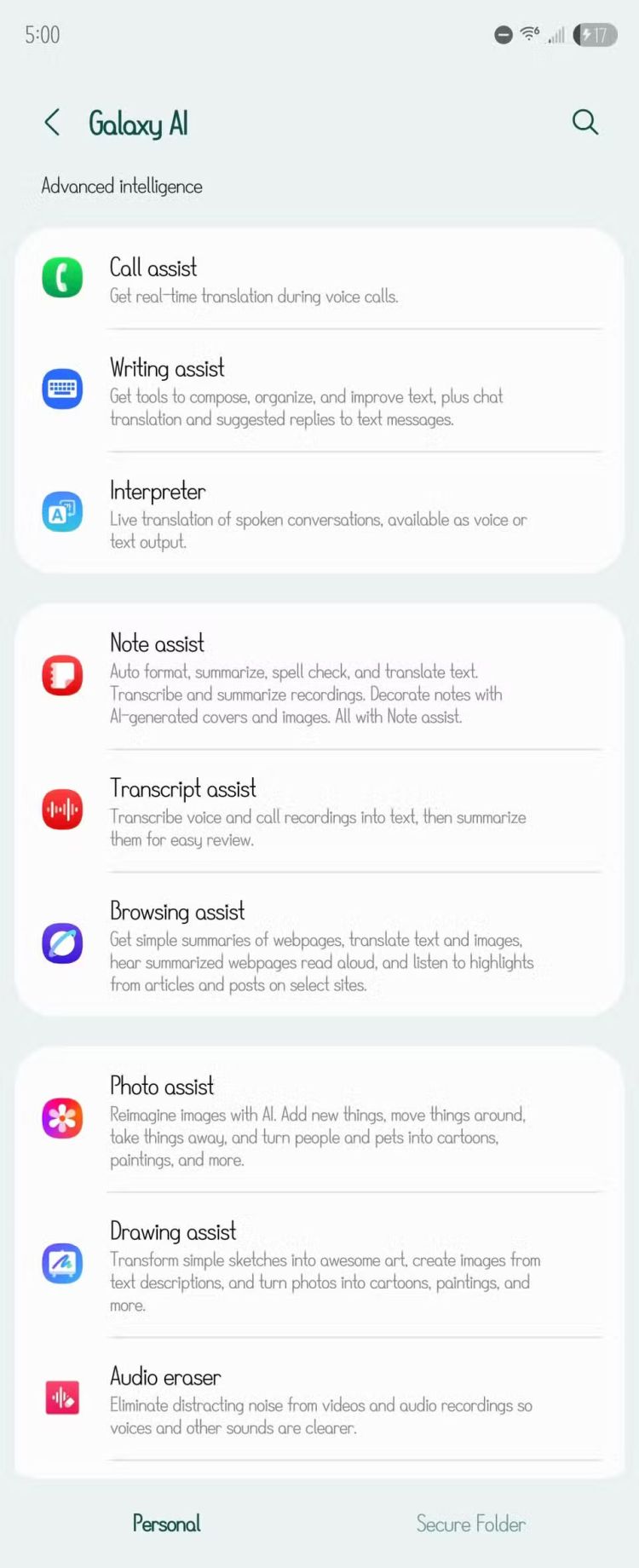 Nói rõ hơn, tôi thực sự thích cách Samsung tích hợp các tính năng AI. Chúng chủ yếu được liệt kê ở một nơi trong ứng dụng Cài đặt, và bạn có thể xem tổng quan về chức năng của từng tính năng. Cài đặt > Galaxy AI cung cấp cho bạn danh sách đầy đủ các phần mềm mà Samsung coi là một phần của Galaxy AI.