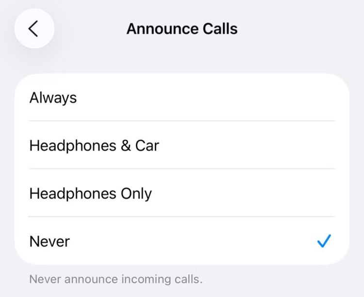 Bạn có thể tắt tất cả hoặc một số tùy chọn này, tùy theo sở thích. Bạn cũng có thể vào menu phụ "Thông báo cuộc gọi" và "Thông báo thông báo" trong mục "Yêu cầu Siri" để ngăn Siri báo cho bạn biết ai đang gọi hoặc làm phiền bạn bằng thông báo khi bạn đang nghe nhạc.