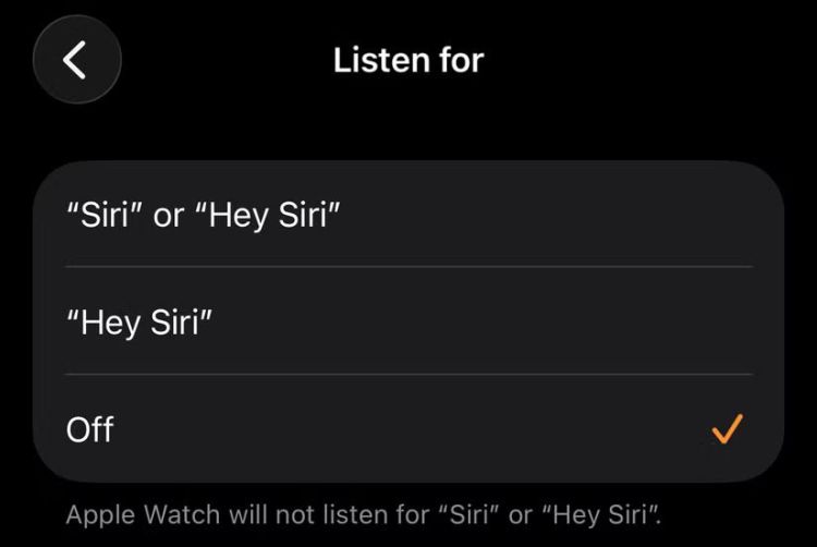 Để thực hiện việc này, hãy khởi chạy ứng dụng Watch trên iPhone đã được ghép nối với Apple Watch. Cuộn xuống cho đến khi bạn thấy Siri, sau đó nhấn vào tùy chọn "Listen for" (Nghe) và chọn "Off" (Tắt). Bây giờ, hãy quay lại màn hình trước đó và tắt tùy chọn "Raise to Speak" (Nâng để nói) và "Press Digital Crown" (Nhấn Digital Crown) để tắt Siri vĩnh viễn.