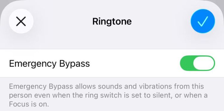 Bạn cũng có thể chọn bỏ qua cài đặt chế độ im lặng của thiết bị để cho phép một liên hệ phát ra âm thanh cảnh báo trên thiết bị bất kể cài đặt của bạn. Bạn có thể thực hiện việc này với bất kỳ liên hệ nào trên iPhone, bất kể họ có được đặt làm liên hệ khẩn cấp hay không.