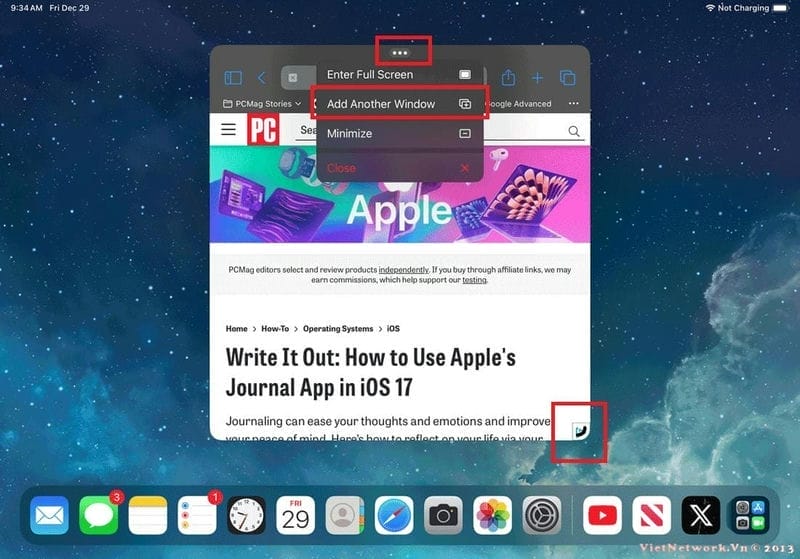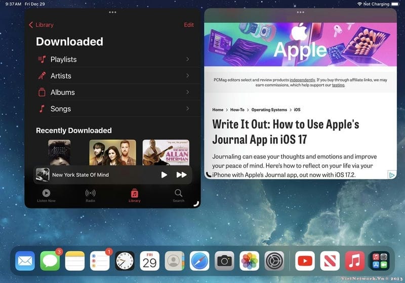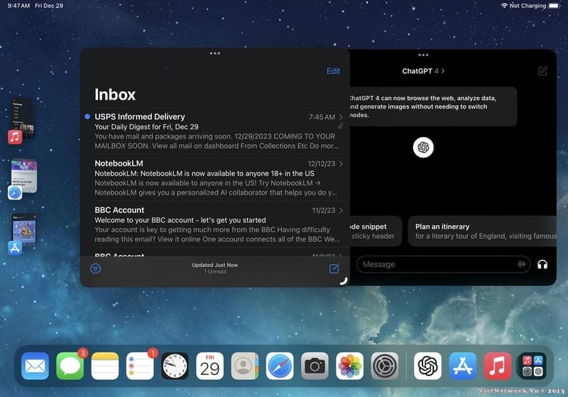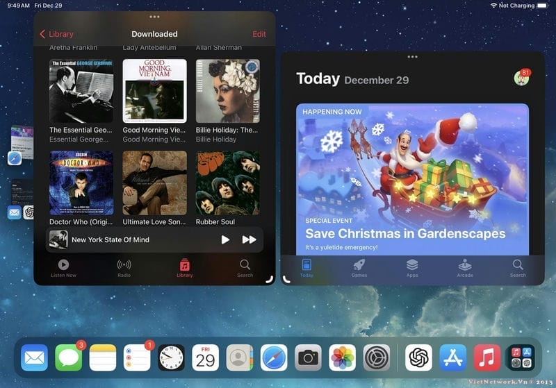 Sau đó, bạn có thể mở cửa sổ thứ hai từ Màn hình chính hoặc Dock. Hai cửa sổ đang mở xuất hiện cạnh nhau. Bạn có thể di chuyển từng cửa sổ bằng cách kéo và thả nó bằng thanh tiêu đề và thay đổi kích thước bằng cách kéo đường cong.