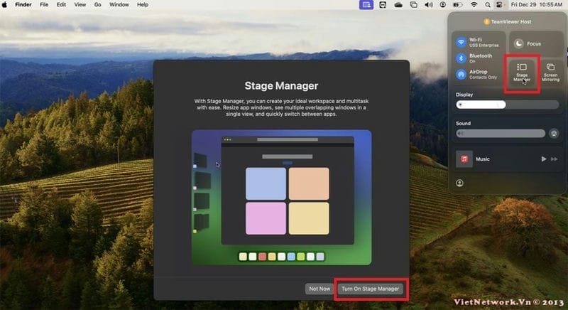 Trên máy Mac, trước tiên bạn có thể bật Trình quản lý giai đoạn rồi mở ứng dụng bạn muốn sử dụng hoặc mở ứng dụng rồi bật Trình quản lý giai đoạn. Dù bằng cách nào, hãy bật Trình quản lý giai đoạn bằng cách nhấp vào biểu tượng Trung tâm điều khiển trên thanh menu và chọn Trình quản lý giai đoạn. Lần đầu tiên bạn thực hiện việc này, một cửa sổ sẽ bật lên để giải thích về Trình quản lý giai đoạn. Nhấp vào Bật Trình quản lý sân khấu.