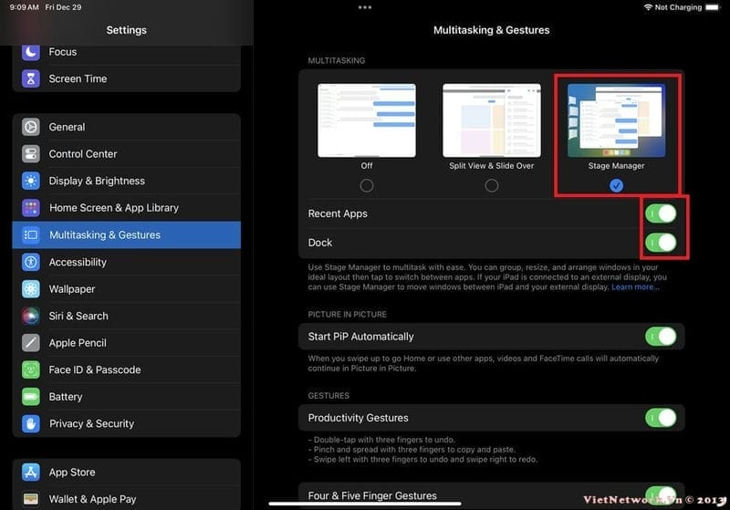 Tiếp theo, bạn cần bật Trình quản lý giai đoạn trước khi có thể sử dụng nó. Đi tới Cài đặt > Đa nhiệm & Cử chỉ và bật công tắc cho Trình quản lý giai đoạn. Bật Ứng dụng gần đây để truy cập các ứng dụng đang mở ở phía bên trái màn hình và Dock nếu bạn muốn xem các ứng dụng trong Dock khi sử dụng Trình quản lý giai đoạn.