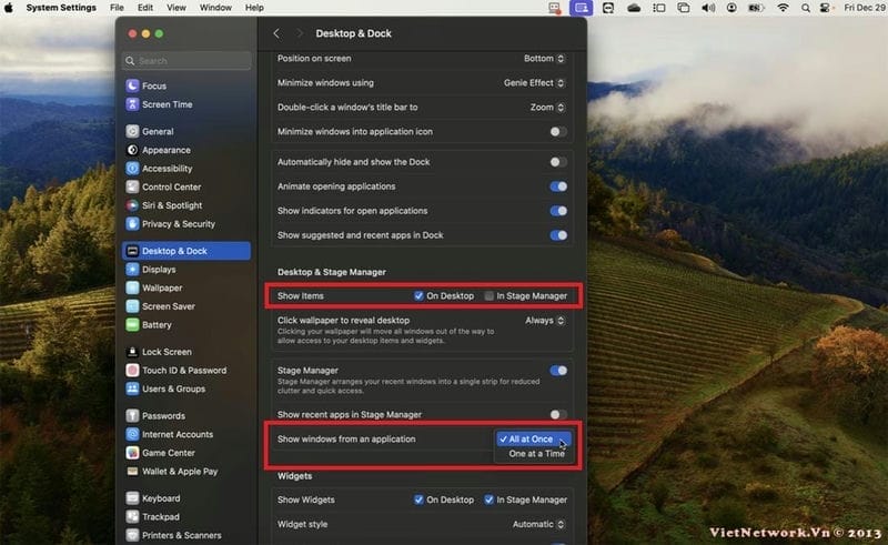Để tùy chỉnh một số cài đặt nhất định cho Trình quản lý sân khấu trên máy Mac, hãy đi tới Cài đặt hệ thống > Màn hình nền & Dock và cuộn xuống phần Màn hình nền & Trình quản lý sân khấu. Đối với Hiển thị các mục, việc bỏ chọn cài đặt cho Trình quản lý trong màn hình sẽ ẩn mọi biểu tượng trên màn hình khi Trình quản lý màn hình được bật. Việc tắt công tắc Hiển thị ứng dụng gần đây trong Trình quản lý giai đoạn sẽ ẩn mọi hình thu nhỏ đang mở ở bên trái. Trong cả hai trường hợp, nhấp vào bất kỳ đâu trên màn hình sẽ hiển thị hình thu nhỏ và các mục trên màn hình