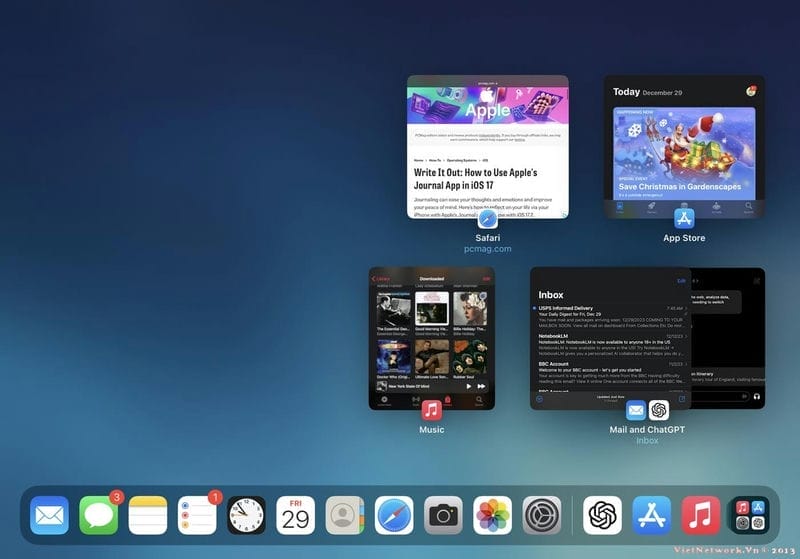 Không thể tìm thấy cửa sổ đang mở mà bạn muốn trong bố cục Trình quản lý giai đoạn? Bạn muốn đóng một số cửa sổ Trình quản lý giai đoạn nhất định? Vuốt lên từ cuối màn hình để xem tất cả các ứng dụng đang mở của bạn. Sau đó, bạn có thể chỉ cần nhấn vào cửa sổ bạn muốn xem ở giữa hoặc vuốt hình thu nhỏ lên để xóa cửa sổ đó.