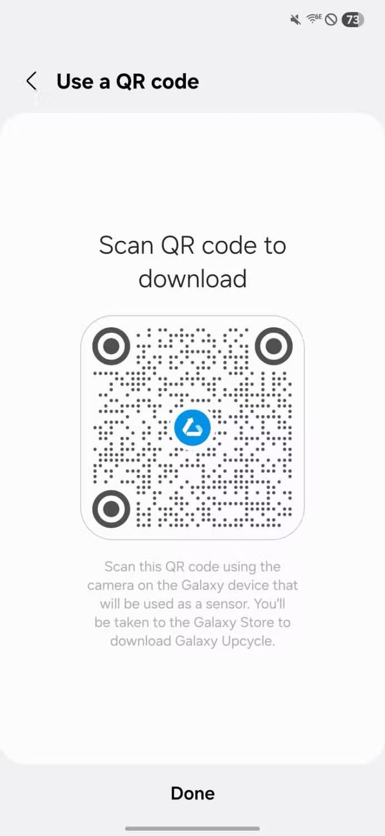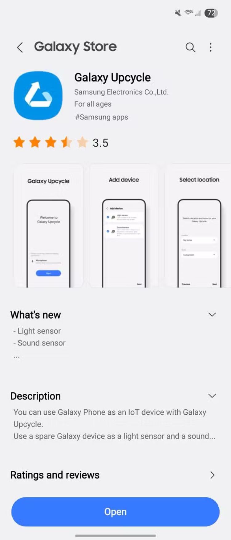 Lấy chiếc điện thoại Galaxy cũ của bạn và sử dụng ứng dụng camera để quét mã QR. Thao tác này sẽ tự động mở trang Galaxy Store cho ứng dụng Galaxy Upcycle. Cài đặt ứng dụng. Mở ứng dụng và làm theo hướng dẫn. Chọn xem bạn muốn thiết bị hoạt động như một "Cảm biến ánh sáng" hay "Cảm biến âm thanh".