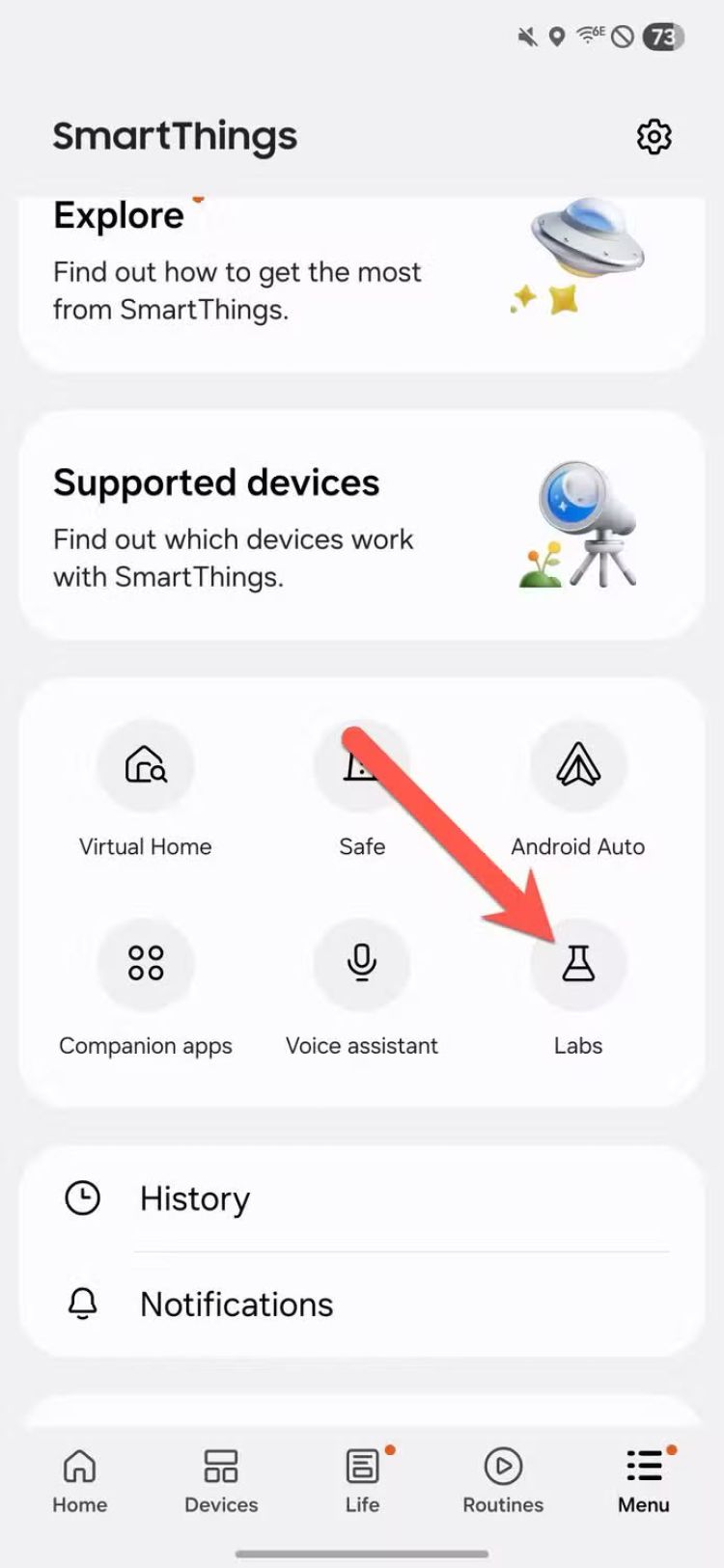 Sau khi đã giải quyết xong những vấn đề trên, chúng ta hãy bắt tay vào việc chính. Đầu tiên, mở SmartThings trên điện thoại chính của bạn. Chạm vào biểu tượng menu ở góc dưới cùng, sau đó chọn "Labs". Tìm dịch vụ "Galaxy Upcycle" và chạm vào đó. Bạn sẽ thấy một lời giải thích ngắn gọn về tính năng này cho đến khi ứng dụng hiển thị mã QR trên màn hình điện thoại chính của bạn.