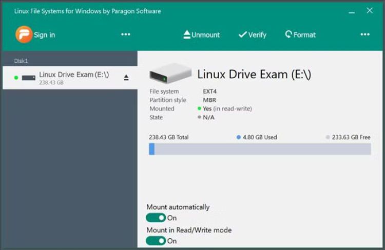 Bây giờ, tùy chọn tiếp theo là một công cụ trả phí có tên là Linux File System for Windows của Paragon Software. Công cụ này nhanh hơn, có nhiều tính năng hơn và có thể đọc (không ghi) hệ thống tệp BTRFS—nghĩa là tôi có thể sao chép các tệp từ hệ thống Linux nhưng không thể dán các tệp mới vào đó—mặc dù có hạn chế nhưng đủ tốt cho trường hợp sử dụng của tôi!