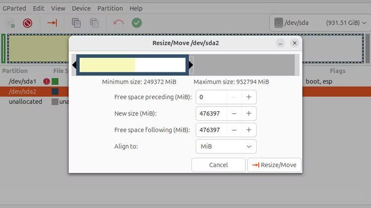 Từ đây, bạn có thể chọn "Physical Drive" từ menu thả xuống ở góc trên bên trái. Xác định phân vùng Linux, nhấp chuột phải vào phân vùng đó và chọn "Resize/Move". Tiếp theo, giảm kích thước để tạo chỗ cho phân vùng được chia sẻ.