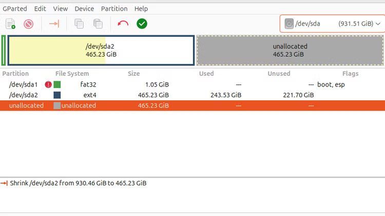 Mọi thứ có thể phức tạp hơn một chút nếu bạn quyết định thu nhỏ phân vùng Linux vì tiện ích Quản lý đĩa Windows không thể đọc các tệp Linux trong đó. Bạn có thể thử sử dụng công cụ quản lý đĩa Linux như GParted nhưng Linux không cho phép thay đổi kích thước phân vùng đang được sử dụng.