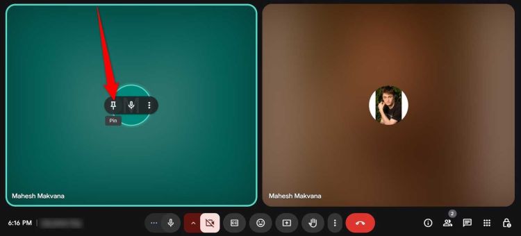 Nếu bạn muốn tập trung vào một khách mời họp cụ thể, bạn có thể ghim nguồn cấp dữ liệu video của họ. Theo cách này, nguồn cấp dữ liệu video của họ luôn ở trên màn hình của bạn bất kể ai đang nói. Để thực hiện điều đó, hãy di con trỏ qua nguồn cấp dữ liệu video của người đó và nhấp vào biểu tượng ghim.