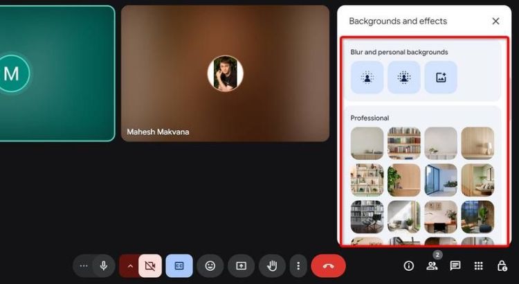 Nếu bạn không muốn khách tham dự cuộc họp nhìn thấy mèo của bạn đang chơi đùa phía sau bạn, bạn có thể làm mờ hoặc thay thế nền của mình. Để thực hiện việc đó, trong thanh dưới cùng của Google Meet, hãy nhấp vào ba dấu chấm. Trong menu mở ra, hãy chọn "Nền và Hiệu ứng".