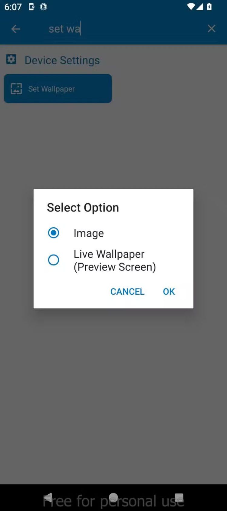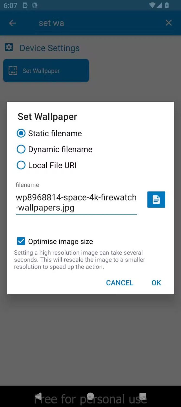 Bây giờ, hãy chạm vào biểu tượng "+" trên thẻ Hành động và tìm kiếm "Đặt Hình nền". Chạm vào đó, chọn tên "Tệp Tĩnh", sau đó chạm vào biểu tượng tệp và chọn hình nền đầu tiên trong ngày. Chạm vào "OK".