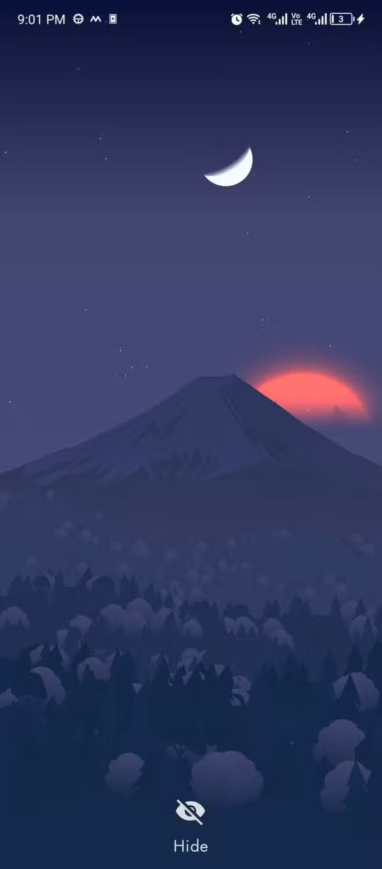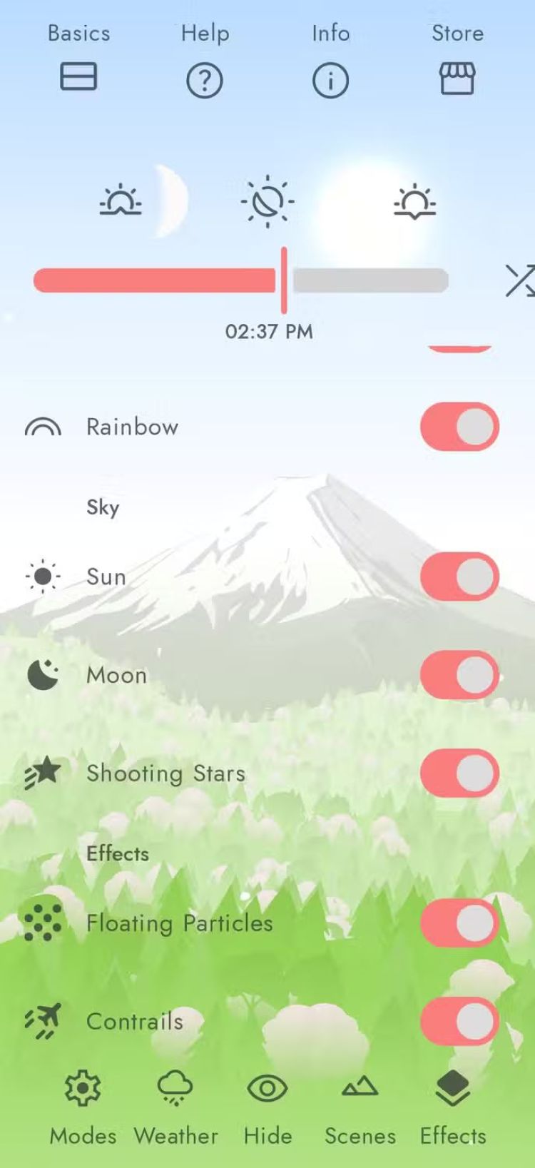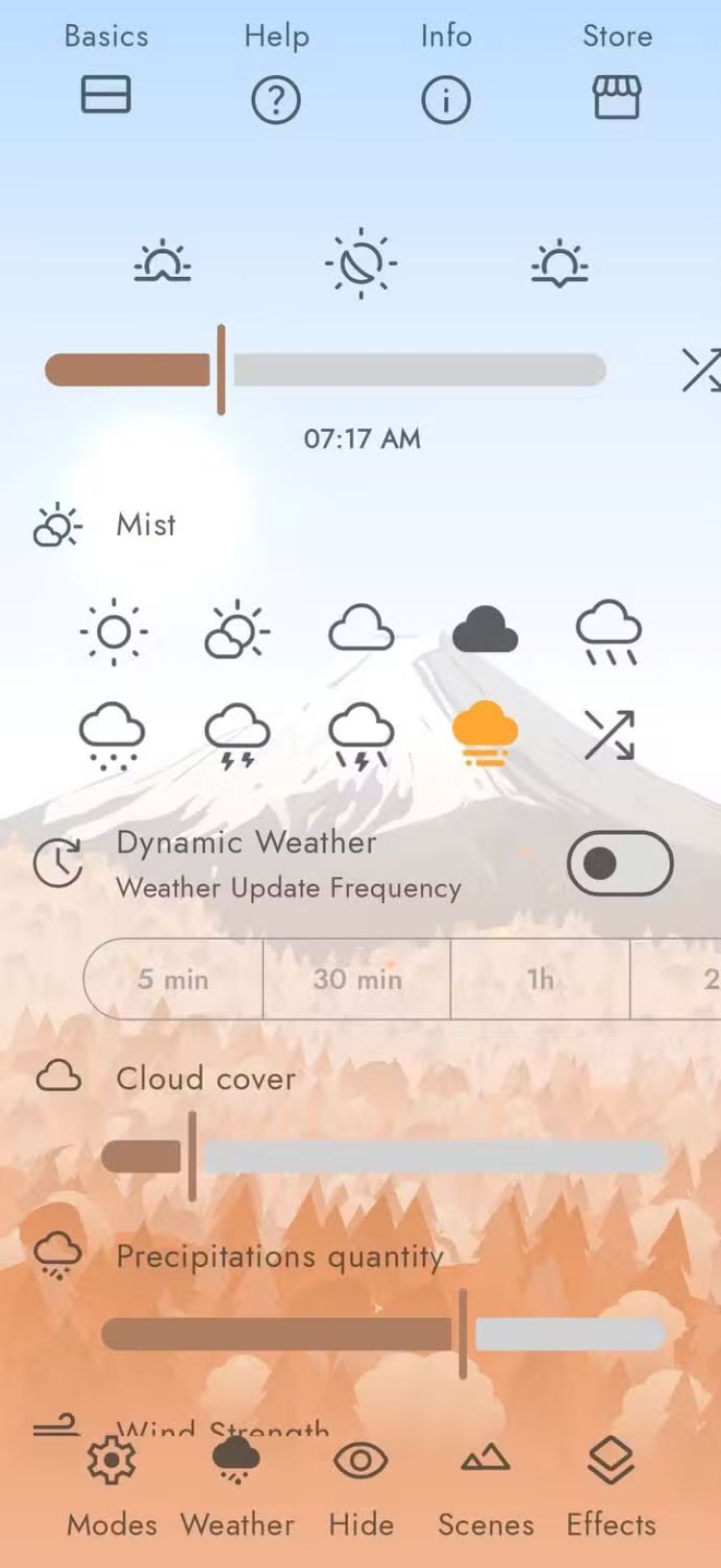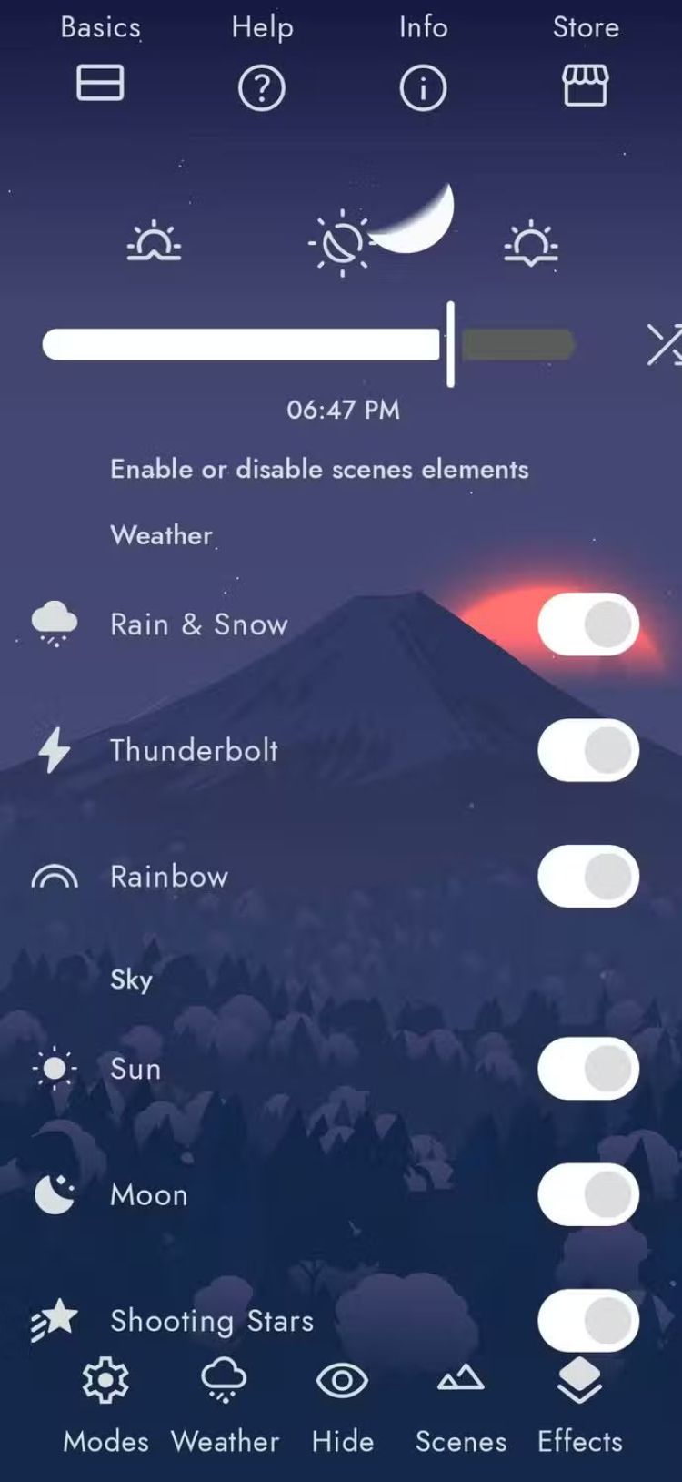 Hình nền động là một cảnh quan tương tác, thay đổi liên tục trong ngày. Mặt trăng mọc và mặt trời mọc tương ứng với thời gian thực tế. Bạn cũng có thể thay đổi điều kiện thời tiết của cảnh này—làm cho nó mờ sương, thay đổi độ che phủ của mây, điều chỉnh cường độ mưa hoặc gió. Bạn thậm chí có thể cấp cho ứng dụng quyền truy cập vị trí trực tiếp của mình và bật cập nhật thời tiết để cảnh tương ứng với thời tiết tại địa phương. Để tùy chỉnh thêm, hãy thử chuyển đổi các hiệu ứng như vệt khói, hạt nổi, sao băng, cầu vồng, v.v.