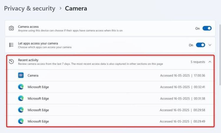 Để xem các ứng dụng đã truy cập vào camera hoặc micrô của bạn gần đây, hãy vào Cài đặt > Quyền riêng tư & Bảo mật, chọn "Camera" hoặc "Micrô" và nhấp vào "Hoạt động gần đây".