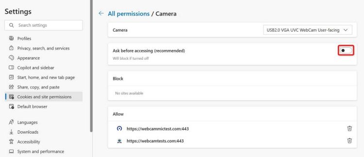 Bạn có thể vô hiệu hóa quyền truy cập vào camera hoặc micrô cho các trang web cụ thể. Để tắt quyền truy cập vào các mục này cho tất cả các trang web, hãy tắt nút chuyển "Hỏi trước khi truy cập (Khuyến nghị)".