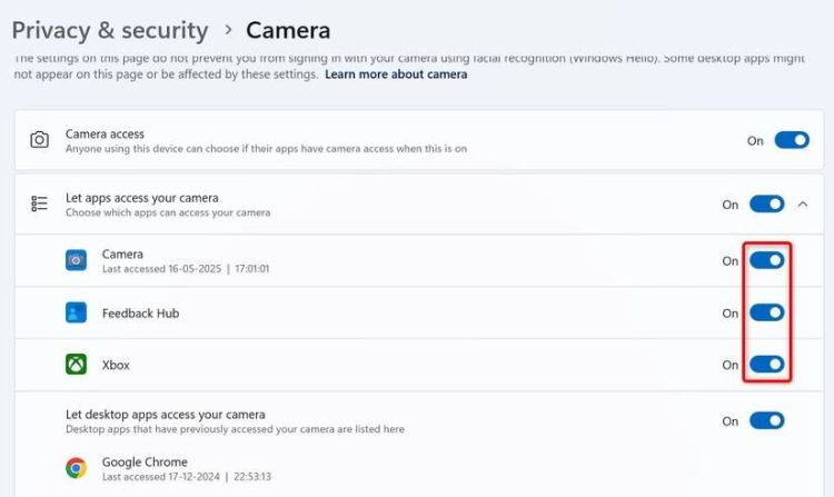 Khi một ứng dụng truy cập vào camera của PC, Windows 11 sẽ hiển thị thông báo toast có nội dung Camera On. Điều này cho biết ứng dụng đã kích hoạt camera của PC. Khi ứng dụng ngừng sử dụng camera, bạn sẽ thấy một thông báo khác có nội dung Camera Off. Ngoài ra, trên nhiều máy tính, bạn sẽ thấy đèn bên cạnh camera vật lý sáng lên, cho biết camera đang được sử dụng.