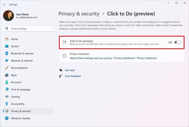 Khi sử dụng Click to Do, tính năng này sẽ chụp ảnh màn hình máy tính của bạn và áp dụng các mô hình AI để phát hiện văn bản và các thành phần trực quan. Quá trình này diễn ra hoàn toàn trên thiết bị, đảm bảo dữ liệu của bạn được bảo mật. Hệ thống không phân tích nội dung để tìm ý nghĩa hoặc gửi bất kỳ thông tin nào lên đám mây trong quá trình nhận dạng.