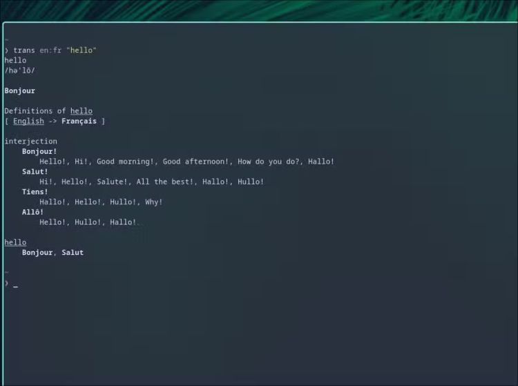 Bạn có thể tra cứu định nghĩa từ điển cho bất kỳ từ nào bằng công cụ TranslateShell. Công cụ này chỉ có sẵn trên Linux, nhưng bạn luôn có thể chạy nó trong môi trường WSL trên Windows.
