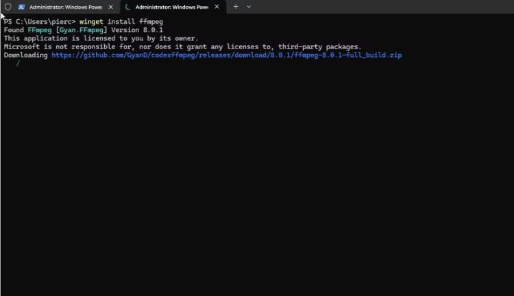 FFmpeg là một công cụ vô cùng tinh vi và mạnh mẽ để xử lý các tệp âm thanh và video. Bạn có thể cài đặt nó trên Windows bằng cách mở cửa sổ dòng lệnh và chạy lệnh sau.