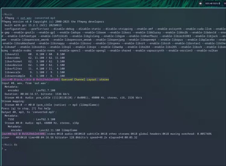 Bạn chỉ cần chạy lệnh cài đặt một lần. FFmpeg có thể chuyển đổi giữa hầu hết mọi định dạng video và âm thanh miễn là bạn nhập đúng tên tệp và phần mở rộng. Tên tệp đầu tiên sẽ là tệp đầu vào của bạn và phần mở rộng của nó, còn tên tệp thứ hai là tệp đầu ra mà bạn muốn nhận được.
