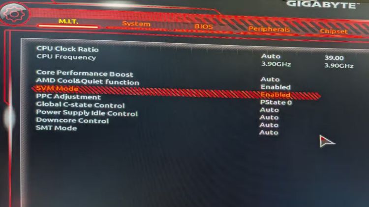 Tên chính xác của cài đặt sẽ khác nhau tùy thuộc vào thương hiệu CPU của bạn. Trên Intel, nó được gọi là Intel VT-x, và trên AMD, nó được gọi là AMD-V, nhưng tên này cũng không phải là phổ biến và có thể thay đổi tùy theo bo mạch chủ. Ví dụ: trên bo mạch chủ Gigabyte của tôi, tôi đang tìm Chế độ SVM, cho phép ảo hóa CPU Ryzen 5 5600G của tôi. Cài đặt này thường nằm dưới các tùy chọn khác. Trên hệ thống của tôi, tôi cần vào MIT > Cài đặt Tần số Nâng cao > Cài đặt CPU Nâng cao, sau đó từ đó bật Chế độ SVM.