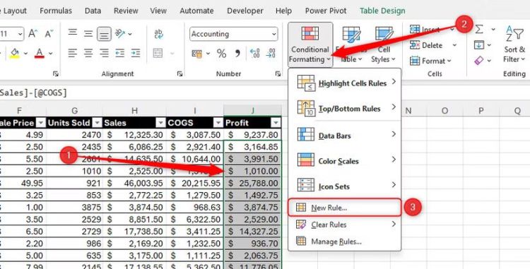 Trước tiên, hãy đảm bảo công thức trong ô đầu tiên của cột là chính xác, vì ô này sẽ được sử dụng làm ô neo tuyệt đối để bạn kiểm tra tính nhất quán của phần còn lại của cột. Tiếp theo, chọn cột bạn muốn kiểm tra (trừ ô neo) bằng cách chọn ô thứ hai và nhấn Ctrl+Shift+Mũi tên xuống. Sau đó, trong tab Trang chủ, nhấp vào Định dạng có Điều kiện > Quy tắc Mới.