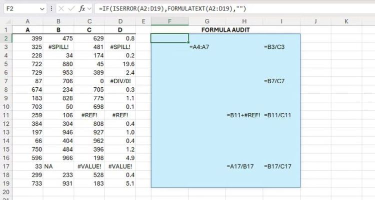 Kết quả của công thức đơn này sẽ tràn ra toàn bộ khu vực kiểm tra, chỉ trả về công thức của các ô chứa lỗi.