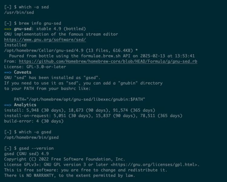 Hãy nhớ rằng hầu hết các lệnh đều chấp nhận tùy chọn --version hoặc --help có thể cho bạn biết phiên bản bạn đang sử dụng. Một chi tiết quan trọng khác là các công cụ GNU thường được cài đặt với tên khác nhau để tránh xung đột. Ví dụ, gói Homebrew cho sed được gọi là gnu-sed và cài đặt dưới dạng gsed:
