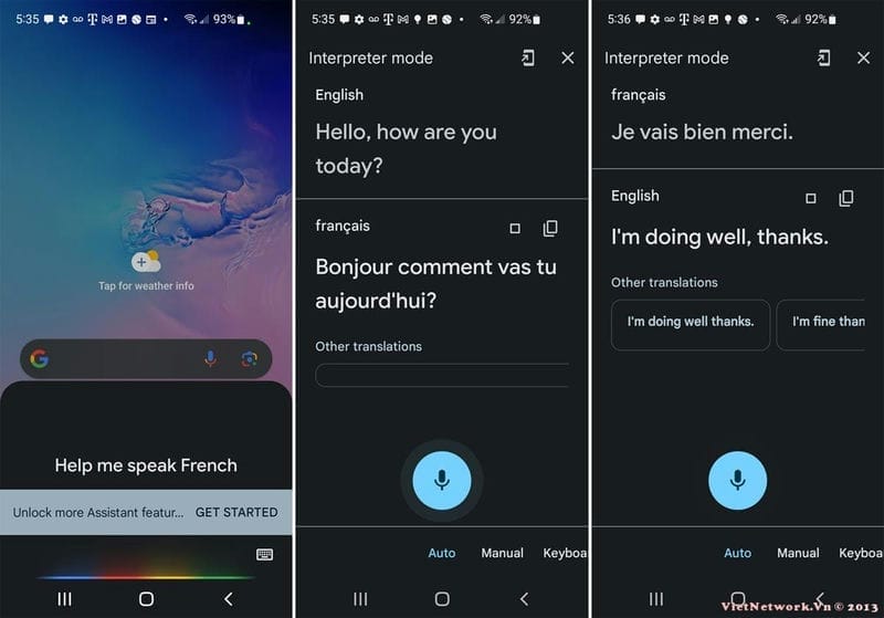 Nếu bạn yêu cầu Google bật chế độ phiên dịch, Trợ lý sẽ phát hiện ngôn ngữ của chính bạn rồi hỏi bạn muốn sử dụng ngôn ngữ nào để phiên dịch. Sau khi tính năng này khởi động, hãy nhấn vào biểu tượng micrô và nói điều gì đó bằng ngôn ngữ của bạn. Google hiển thị và đọc phần diễn giải bằng ngôn ngữ khác.