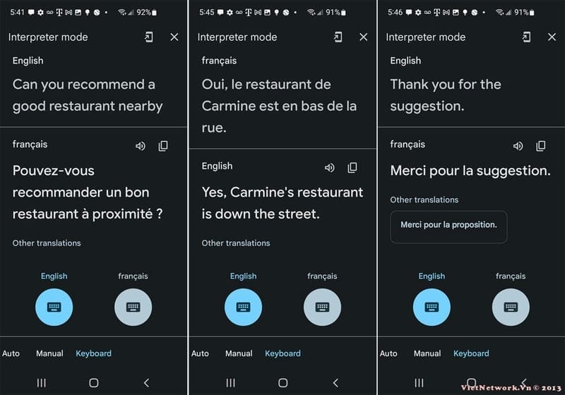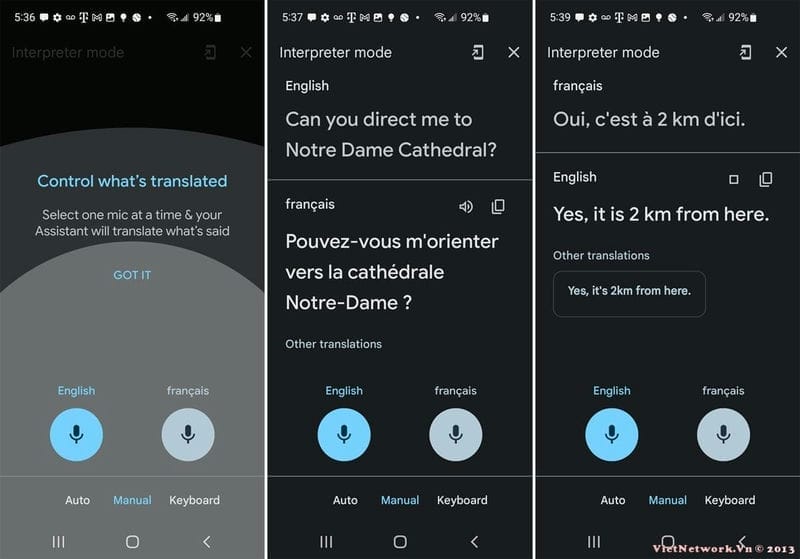 Theo mặc định, Trợ lý sẽ tự động phát hiện ngôn ngữ đang được nói và dịch ngôn ngữ đó sang ngôn ngữ ưa thích của bạn. Điều đó sẽ hoạt động trơn tru hầu hết thời gian. Tuy nhiên, bạn cũng có thể nhấn vào Thủ công để chuyển sang chế độ thủ công. Để tính năng này hoạt động, bạn phải nhấn vào biểu tượng micrô cho ngôn ngữ của bạn khi bạn nói và biểu tượng cho ngôn ngữ khác khi người khác muốn nói.
