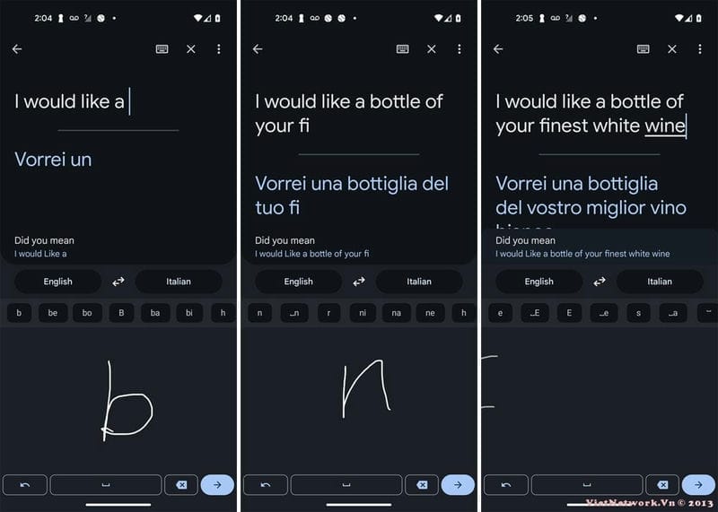 Ngoài ra, hãy nhấn vào biểu tượng cây bút và viết một cụm từ bằng tiếng Anh, mỗi ký tự một bằng ngón tay hoặc bút stylus. Khi bạn nhập các ký tự trên màn hình, ứng dụng sẽ cố gắng dự đoán đầy đủ những gì bạn dự định viết bằng cách hiển thị các kết hợp từ và chữ cái có thể có.